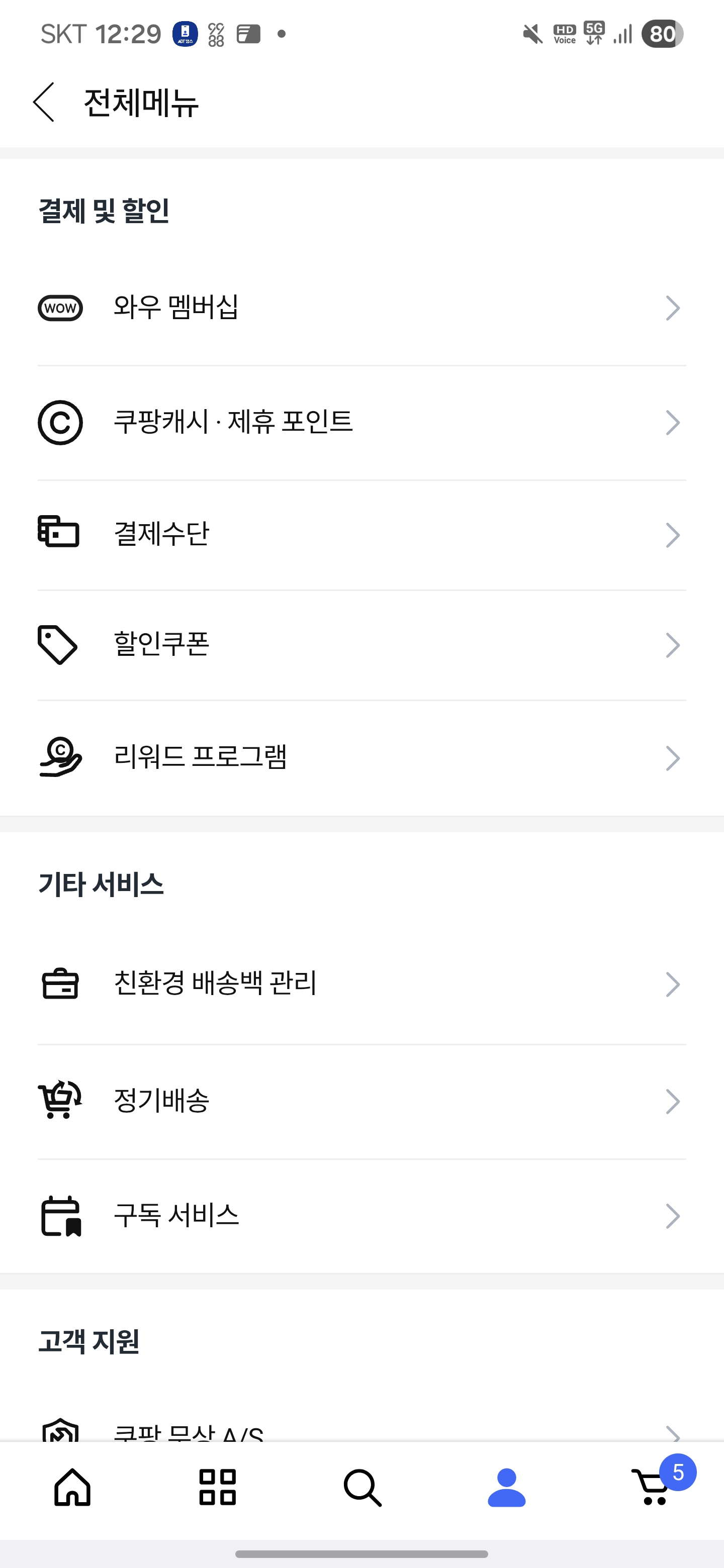 마이쿠팡 페이지에서 ‘결제수단 관리’ 항목을 선택합니다. 웹사이트의 경우 ‘개인정보 관리’ 안에 같은 메뉴가 위치해 있으니 참고하세요.
