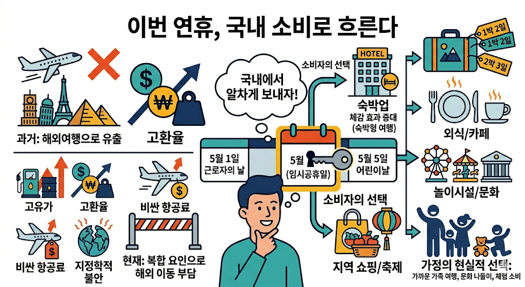 이 말은 곧 소비가 국내에 머물 가능성이 높아졌다는 뜻입니다. 숙박업, 음식점, 카페, 놀이시설, 지역 축제, 쇼핑몰 같은 서비스 업종에는 꽤 반가운 시나리오입니다. 특히 하루짜리 짧은 소비보다 1박 2일 또는 2박 3일 형태의 국내 이동이 늘어나면 체감 효과는 더 커질 수 있습니다.