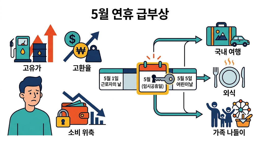 핵심은 고유가와 고환율입니다. 국제유가가 오르면 교통비와 물류비, 생활비 부담이 동시에 커집니다. 여기에 환율까지 높은 수준을 보이면 수입물가 압박이 더해지고, 소비자는 자연스럽게 지갑을 닫게 됩니다. 정부가 임시공휴일을 단순한 휴식 정책이 아니라 내수 진작 카드로 보는 이유가 여기에 있습니다.