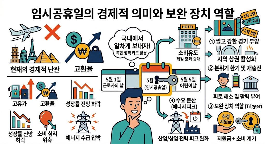 5월 4일 임시공휴일 검토는 단순한 휴일 이슈가 아니라, 얼어붙은 소비 심리를 흔들기 위한 현실적 카드로 읽힙니다. 고유가와 고환율로 숨이 막히는 시기일수록 사람들에게는 ‘지출의 명분’이 필요한데, 연휴는 그 명분을 만드는 가장 직관적인 방식 중 하나입니다.