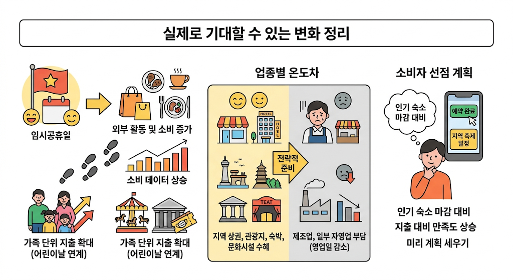 다만 모든 업종이 똑같이 웃는 것은 아닙니다. 제조업이나 일부 자영업은 오히려 영업일 감소를 부담으로 느낄 수 있습니다. 그래서 중요한 것은 ‘하루 더 쉰다’는 사실보다 그 하루가 어디에서 어떤 소비로 연결되느냐입니다. 지역 상권, 관광지, 문화시설, 숙박업계는 전략적으로 준비할수록 수혜 폭이 커질 수 있습니다.